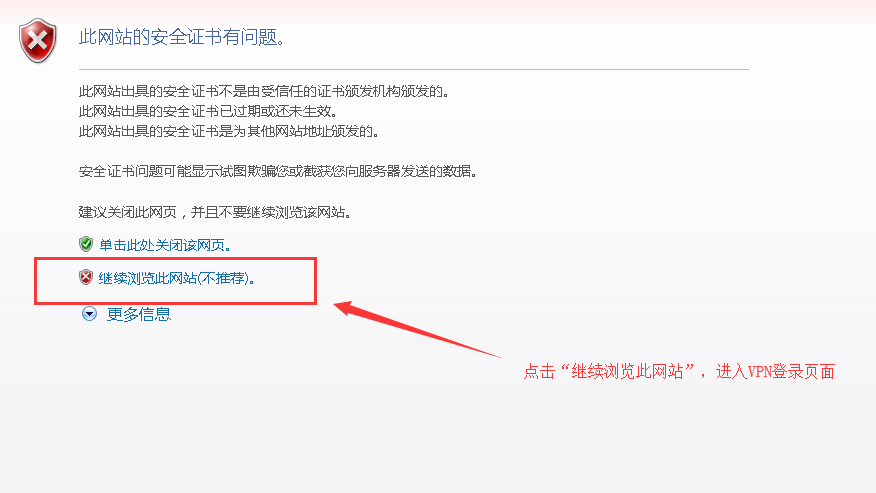本说明以微软的IE 8.0为例,其他浏览器给出的提示和选项可能略有不同,选择能够继续访问的选项即可。