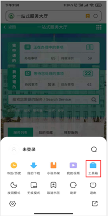 1、手机自带浏览器找到下方的“菜单”,点击工具箱。