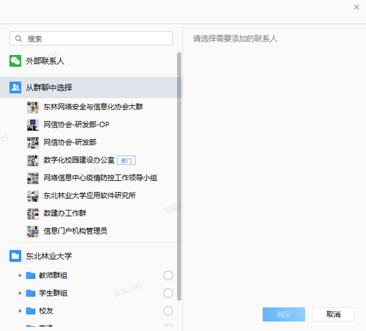 点参与人选择参会人员,可以在群聊中选择,也可以在组织机构树中选或使用搜索。