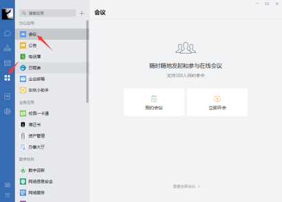 点击工作台(四方块图标)后点击会议图标,可以选择预约会议或者立即开会。