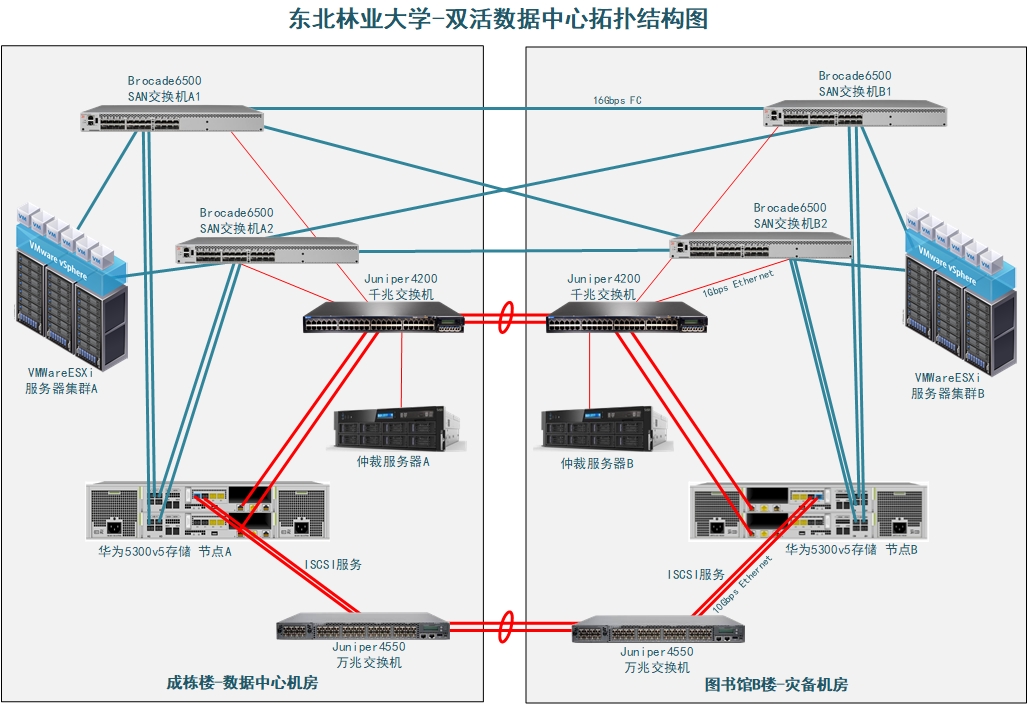我们通过使用惠普、曙光、浪潮等厂商的服务器、Juniper的网络交换机、Brocade的SAN存储交换机、华为的5000系列存储系统、以及VMware vSphere相关的软、硬件件产品,构建了东北林业大学基于软件定义的双活虚拟数据中心。