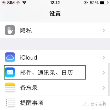 第一步:打开iPhone的“设置”,找到“邮件、通讯录、日历”,如下图: