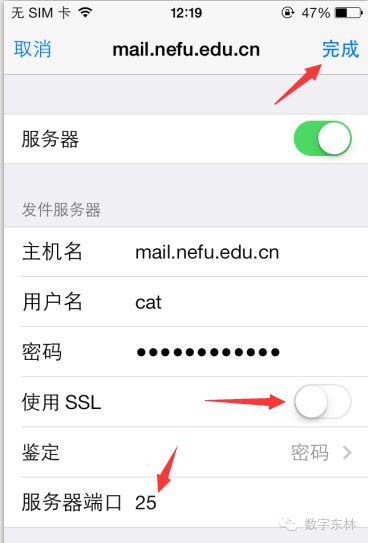 再确认下,SSL是否已经关闭,同时服务器端口号设置为25号,然后点击右上角的完成。