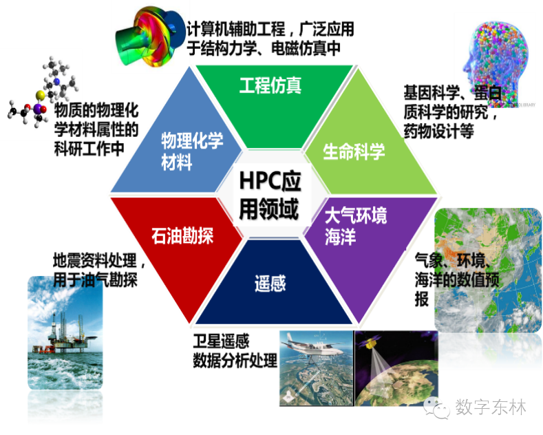 高性能计算应用领域包括CAE仿真、物理化学材料、生命科学、大气环境海洋、遥感、石油勘探等。
