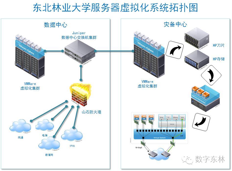 我校的服务器虚拟化系统由两套完整VMware vSphere虚拟化集群构成,分别放置在数据中心机房以及灾备中心机房,目前通过后端存储系统实现远程异地互为备份功能。为数字化校园建设的各业务系统及后端支撑系统提供高速稳定的运行环境。