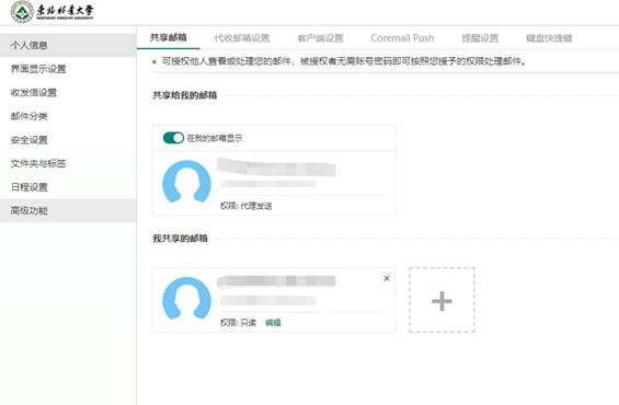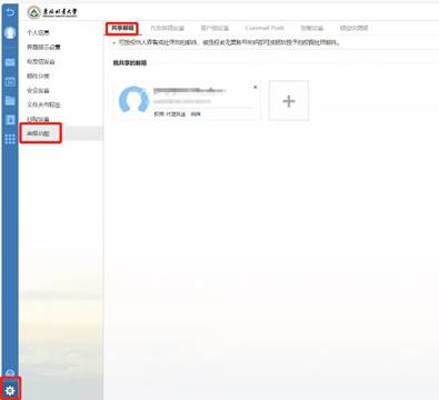 设置步骤: 1.进入方式:进入邮件系统首页,点击左下角“邮箱设置”(齿轮图标)→高级功能→共享邮箱,用户可以查看共享给自己的邮箱用户,也可以共享自己的邮箱给其他用户并设置权限。