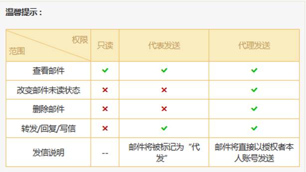 3.共享邮箱权限说明:邮件系统对权限做了严格限制,提供了“只读”、“代表发送”和“代理发送”三种权限,对邮件的读取、读信状态和发送信件操作都有不同的 控制。详细细分如下图所示:
