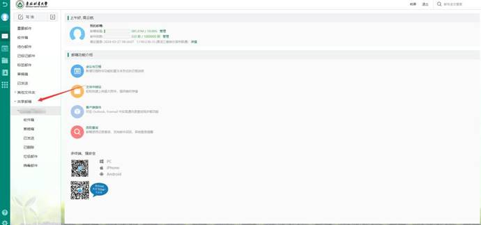 2.查看共享邮箱:被共享人登录 web/客户端可在邮件 文件夹下拉列表看到共享邮箱。
