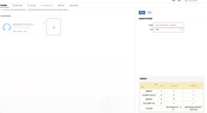 添加共享邮箱:共享邮箱页面下方点击加号图标会从 右侧弹出页面,该页面有两个选项,填写被共享人的邮箱账 号以及共享权限。