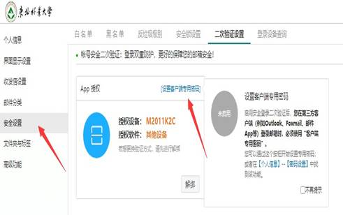 1)登录邮箱点击左下角“邮箱设置”(齿轮图标),安全设置,在二次设置界面 点击设置客户端专用密码