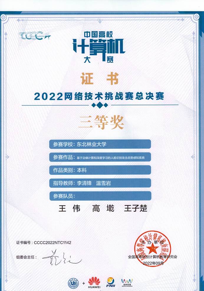 9月4日晚8点,2022中国高校计算机大赛--网络技术挑战赛颁奖会议隆重举行,由网络信息中心李清锋指导的学生团队王伟的作品《基于边缘计算和深度学习的人脸识别攻击态势感知系统》荣获国家三等奖。