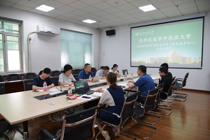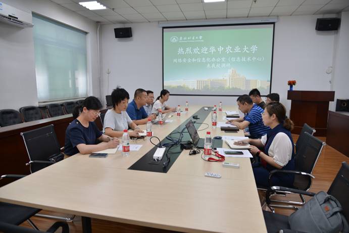2021年7月16日上午,华中农业大学网络安全和信息化办公室副主任黄辉等一行5人到我校网络信息中心进行高校信息化建设管理工作的调研交流,网络信息中心副主任周锋、综合办主任张雪、信息技术部主任吴雷和网络运维部主任郭永双进行了接待。